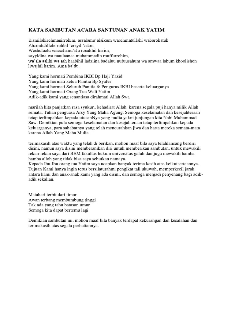 Acara rutin yang bertajuk santunan anak yatim dan dhuafa adalah acara rutin yang biasa diadakan setiap tahunnya. Penutup (mauidzoh hasanah / kultum) 7. Kampung penclut rt.01 rw.03 desa sirnagalih kec. Eiza ditemui usai acara santunan anak yatim piatu di hotel grand situ bulued, sadang, purwakarta, jawa barat, beberapa waktu lalu. Maka kegiatan ini sangatlah penting guna mengingatkan hak hak.